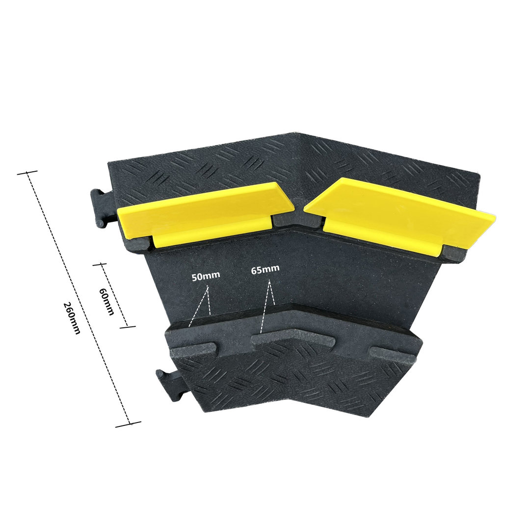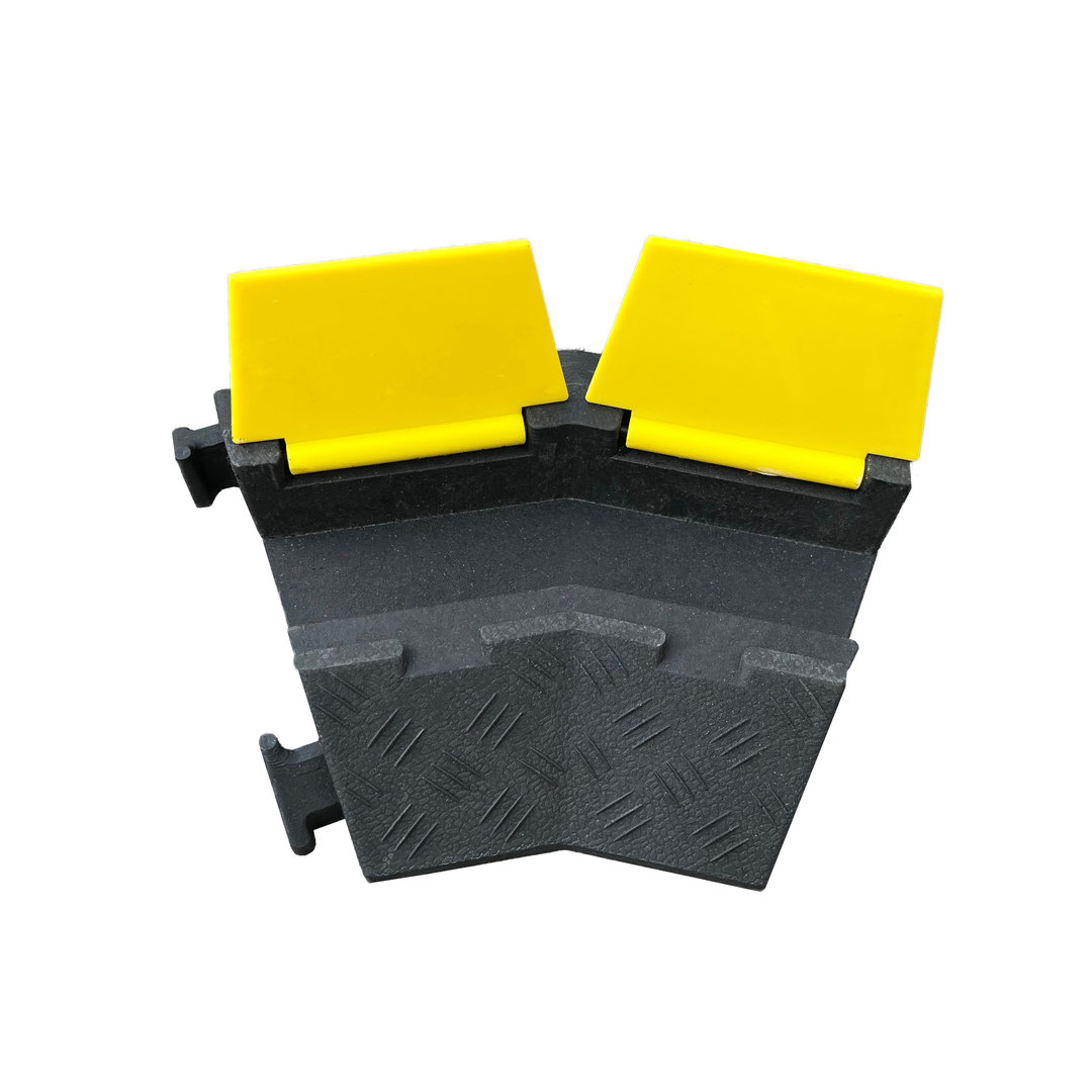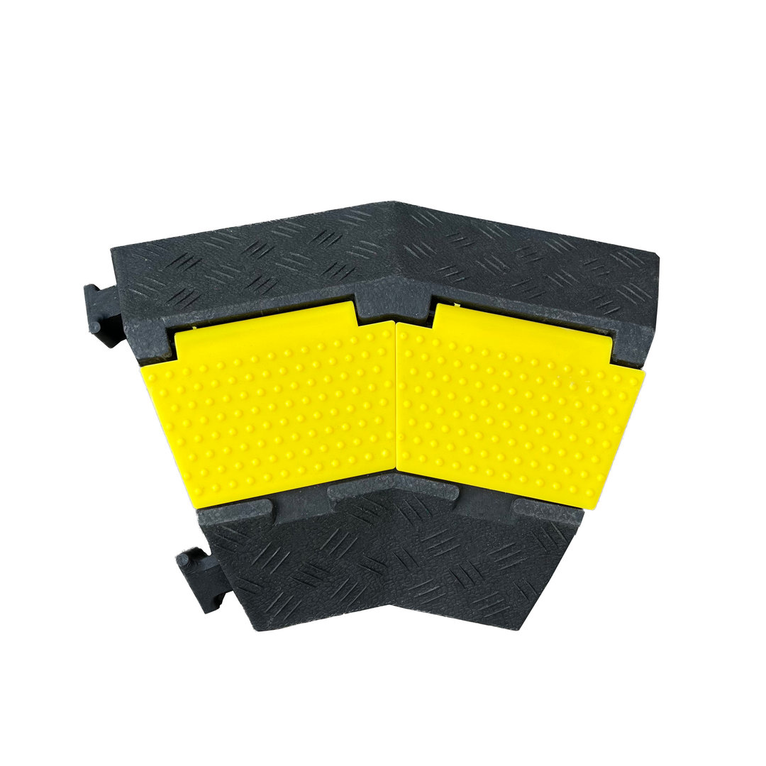 Die Kabelbrücke 1 Kanal BASIC mit 45° Bogen (links) ist eine robuste und praktische Lösung, um Kabel sicher zu verlegen und gleichzeitig vor Beschädigungen zu schützen. Sie ist besonders geeignet für den Einsatz in Bereichen mit viel Verkehr, wie Baustellen, Lagerhallen oder bei Veranstaltungen, und gewährleistet eine sichere Kabelführung. Mit ihrer hohen Belastbarkeit und der rutschhemmenden Struktur ist sie die perfekte Wahl, um Kabel vor Überfahren zu schützen und Stolperfallen zu vermeiden.